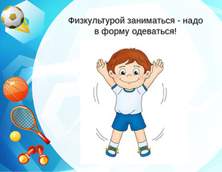 Физкультурное занятие обязательно требует соблюдения техники безопасности в спортзале. Спортивная форма на занятиях - это обязательное условие их проведения. Ребенок получает полное физическое развитие, учится ползать, бегать, лазать. Чтобы вашему ребенку было удобно, необходимо приобрести: футболку, шорты, спортивную обувь, носочки. Нужно помнить, что во время физических упражнений повышается потоотделение, поэтому в этой же одежде, в соответствии с санитарными требованиями, нельзя находиться далее в групповой комнате.